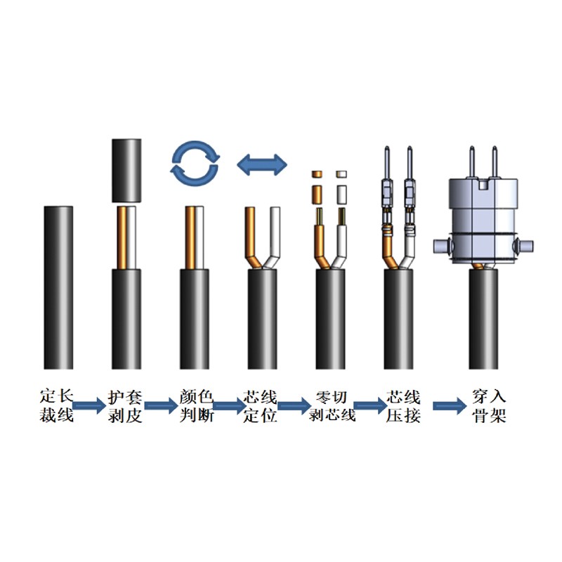 本設(shè)備適用于雙芯線線束進(jìn)行主動(dòng)送線、線束校直、定長(zhǎng)裁切、切剝外皮、芯線顏色分辨、剝芯線、端子壓接、壓接檢測(cè)、穿塑殼工作。